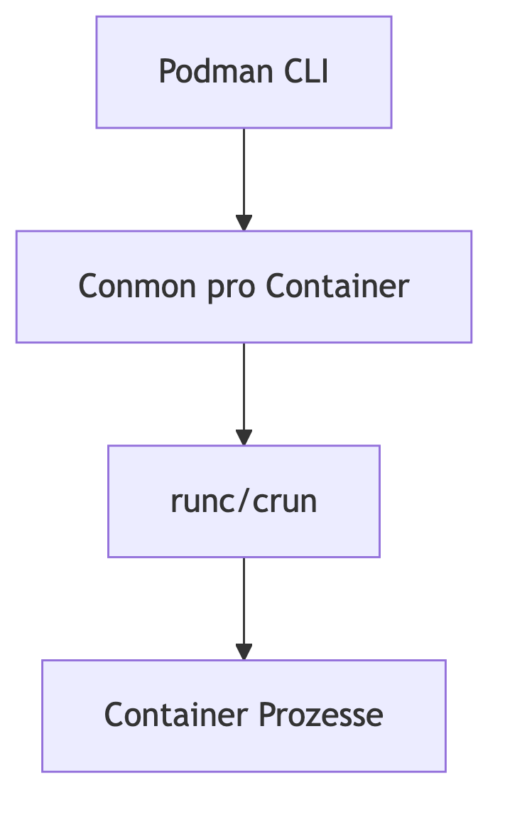 Podman verzichtet bewusst auf diese zentrale Schaltstelle. Stattdessen wird für jeden Container ein Conmon-Prozess erzeugt, der ausschließlich diesen Container überwacht: