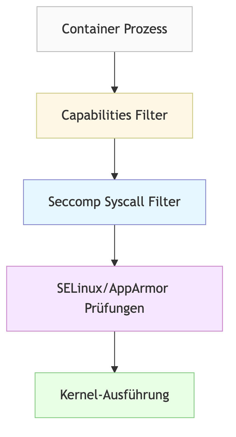 oder AppArmor.Der Schutz ist schichtweise aufgebaut. Jede Schicht wirkt unabhängig und redundant.