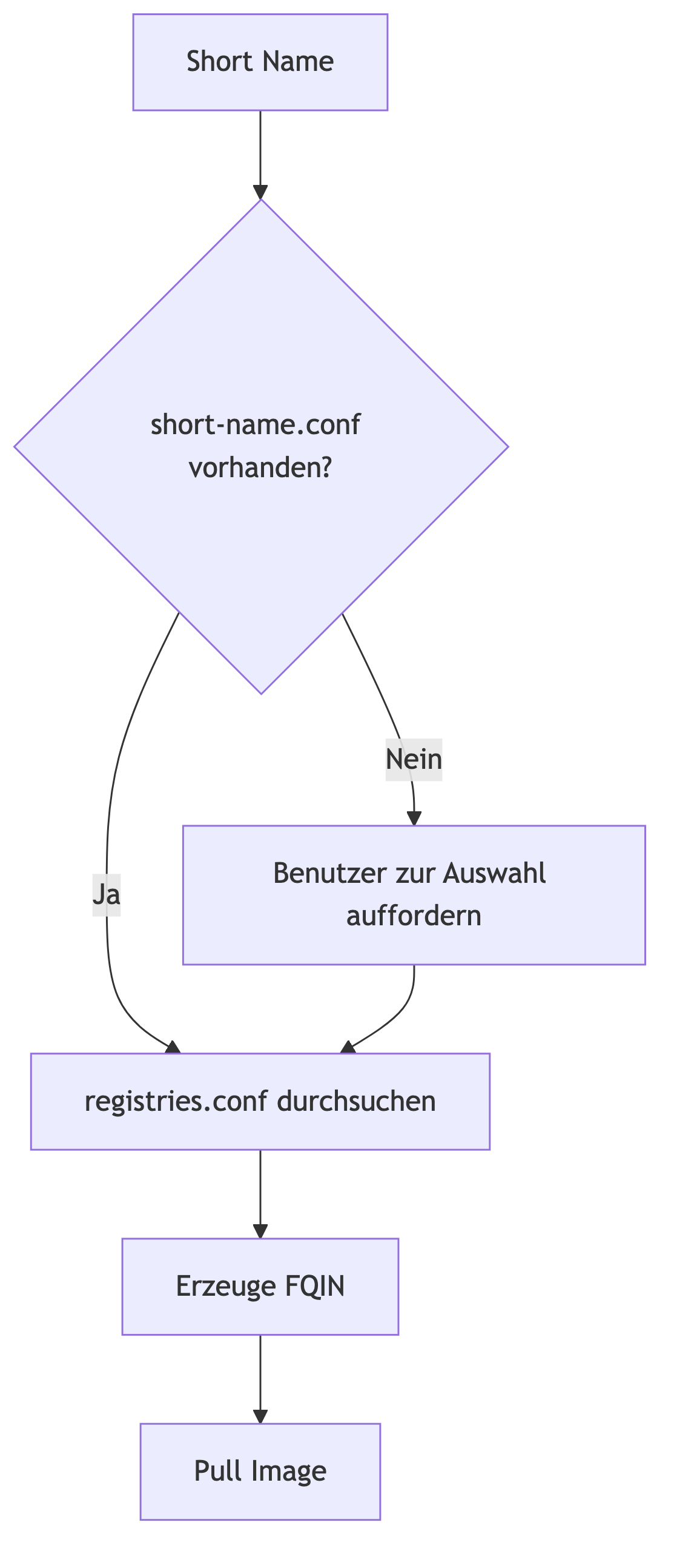 Deshalb besitzt Podman eine explizite Mechanik zur Short-Name-Resolution. Sie ist sicherheitstechnisch so relevant, dass Podman den Benutzer beim ersten Auftreten eines Short-Names zur Bestätigung zwingt.