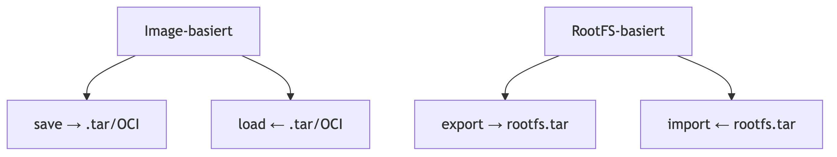 Der Unterschied ist zentral: wer ein Image reproduzierbar übertragen will, nutzt Image-Mechanismen. Wer nur den Zustand eines Containers sichern oder portieren möchte, arbeitet mit RootFS-Prozessen.