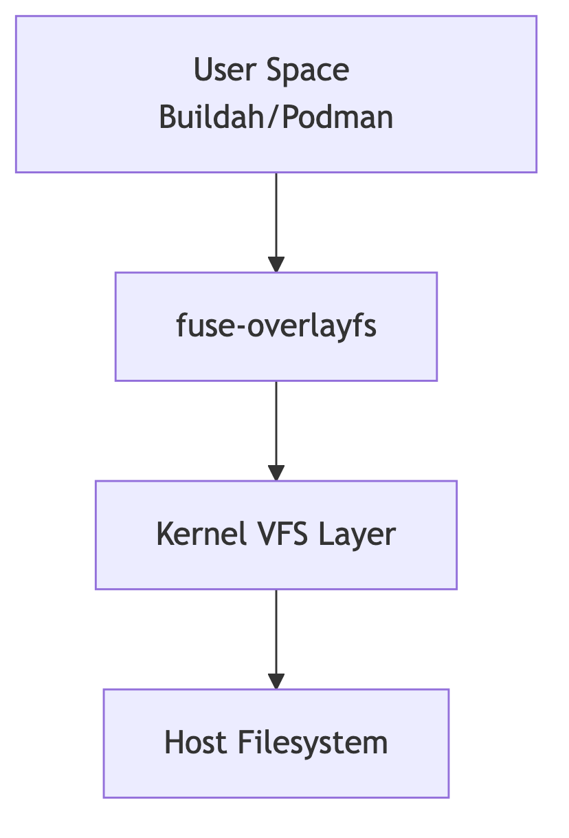fuse-overlayfs verwendet FUSE (Filesystem in Userspace), um Overlay-Semantik ohne Kernelunterstützung zu realisieren. Die Grundidee: statt kernelnahe Copy-on-Write-Operationen direkt im Filesystem-Stack auszuführen, werden sie über ein Userspace-Programm abgewickelt. Das erhöht die Sicherheit – aber es kostet Performance.