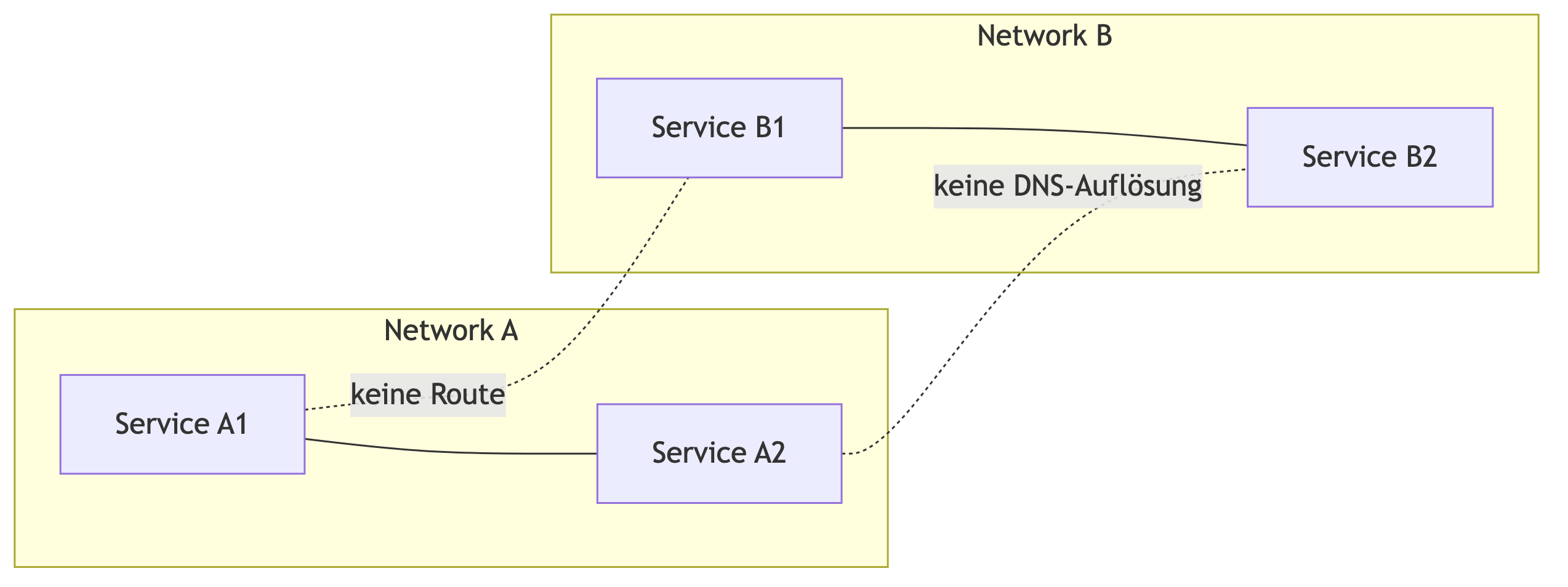 Container aus verschiedenen Netzwerken können sich standardmäßig nicht sehen – weder auf IP- noch auf DNS-Ebene.