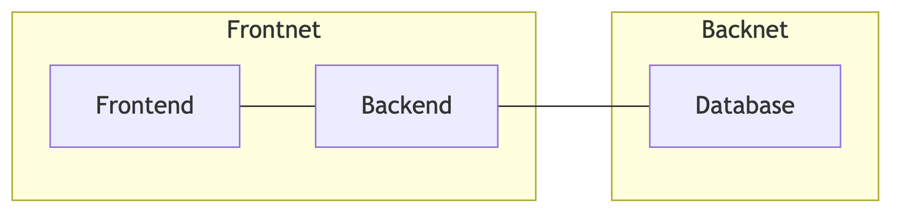 Backend fungiert hier als Gateway zwischen Frontend und Datenbank – jedoch ausschließlich auf Anwendungsebene, da kein L3-Routing zwischen Netzwerken existiert. Ein solcher Aufbau erzwingt klare Grenzen: kein Container sieht mehr als notwendig.