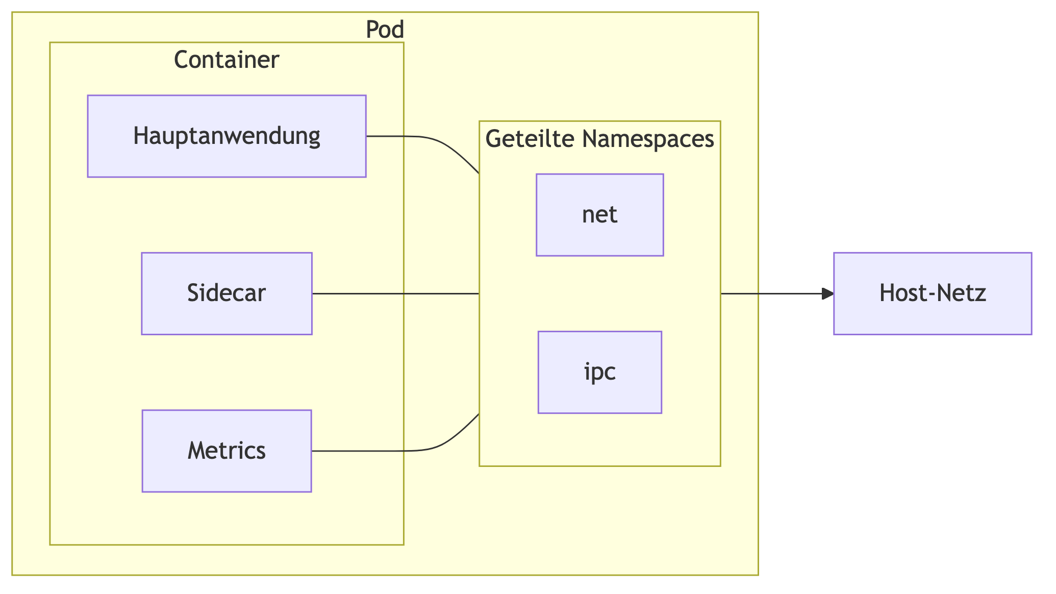 Innerhalb eines Pods kommunizieren Container über localhost, teilen IPC und können optional PID-Sharing nutzen. Das reduziert Komplexität: