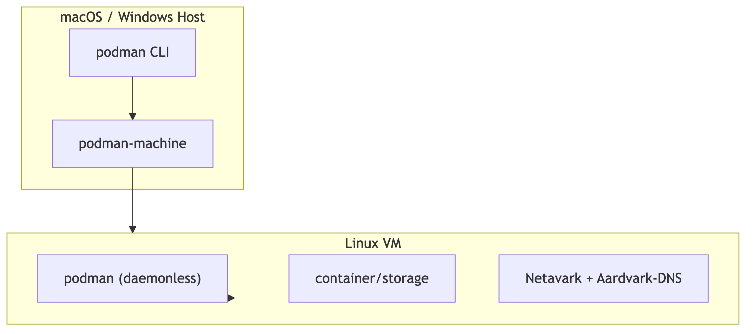 Dieser Aufbau bewahrt Podmans grundlegende Eigenschaften und abstrahiert lediglich den fehlenden Linux-Unterbau.