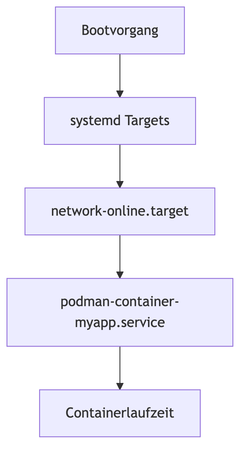 Das Bild ist bewusst simpel, doch es zeigt die Hierarchie: Podman selbst orchestriert keine Bootabhängigkeiten. systemd tut das – und Podman liefert die Mechanik, um Container nahtlos in diesen Graphen einzufügen.