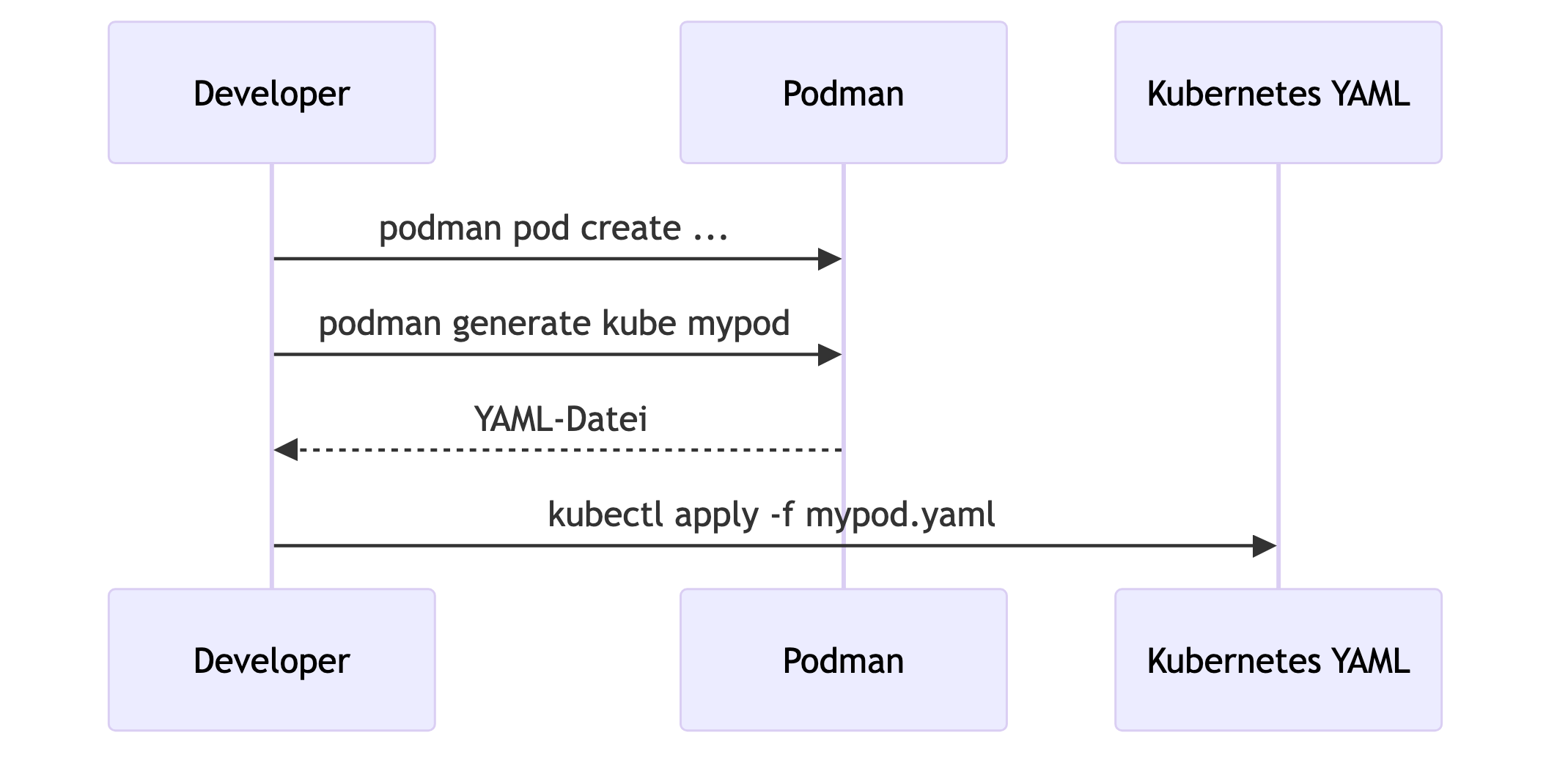 Podman wird hier zu einem Werkzeug zur YAML-Generierung, nicht zum Kubernetes-Laufzeitbackend.