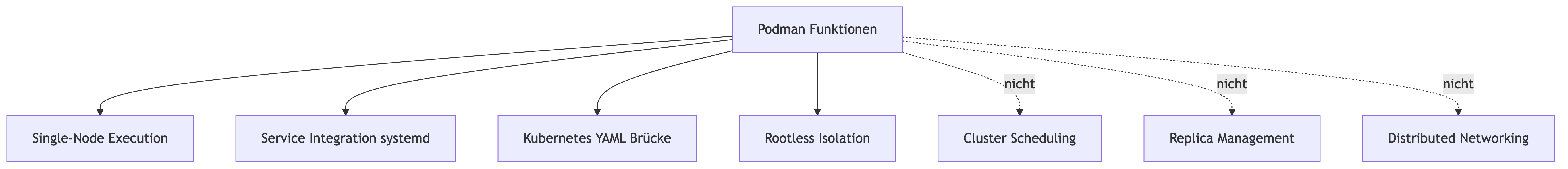 Podman stellt ein reiches Funktionsset bereit, das sich im Kern um lokale Containerlaufzeit, systemnahe Ausführung und Single-Node-Isolation dreht. Die wesentlichen Aufgabenbereiche lassen sich so einordnen: