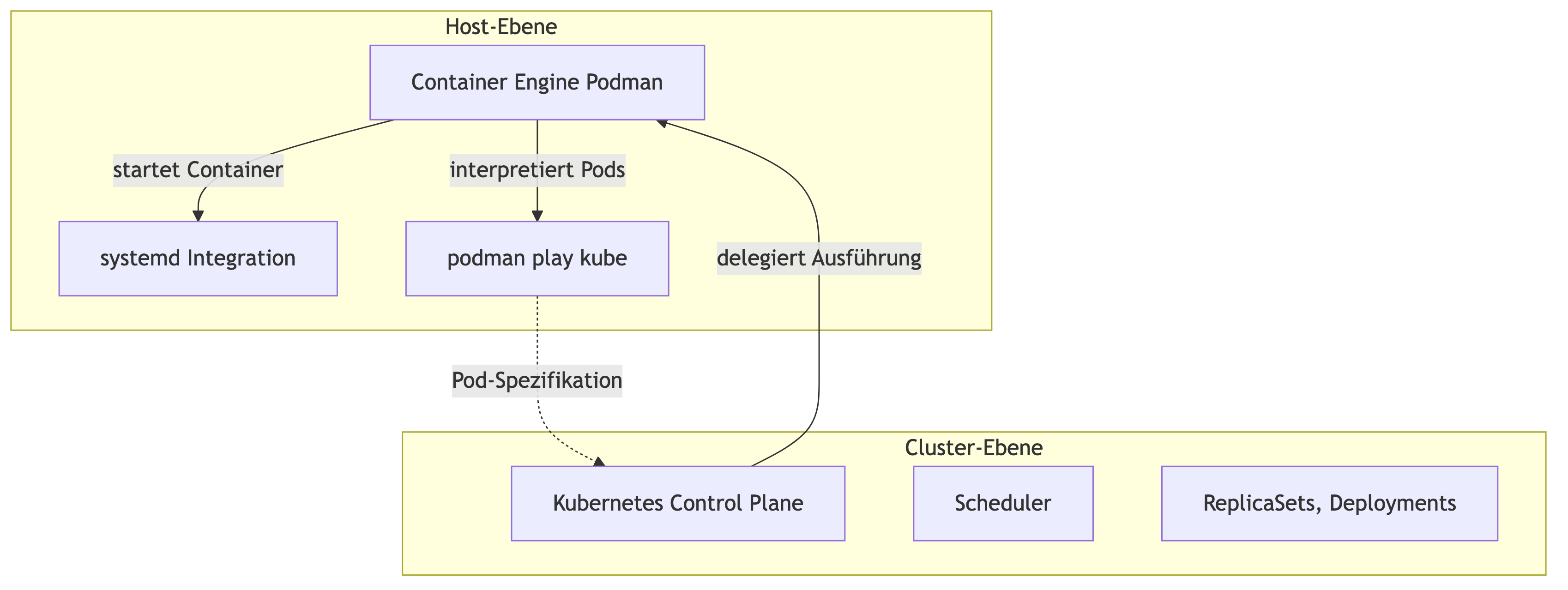 Podman ist ausführende Instanz. Kubernetes ist steuernde Instanz.