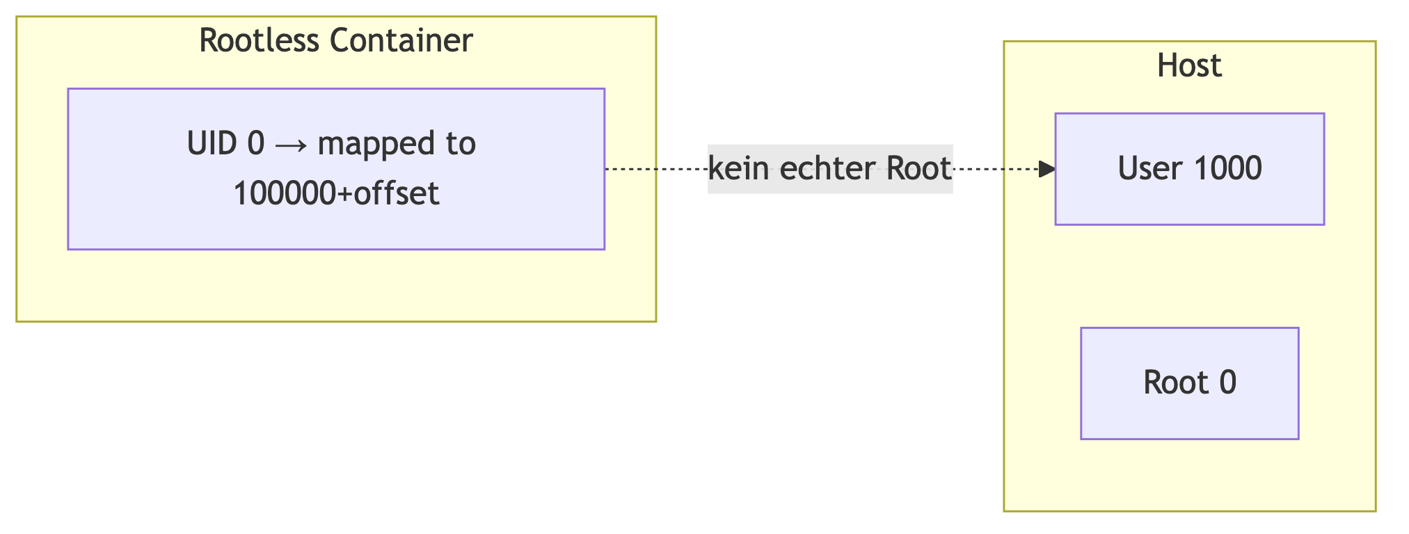 Damit wird eine der größten Sicherheitslücken des klassischen Docker-Modells geschlossen: Dort entspricht root im Container meist root auf dem Host – ein kritisches Risiko.